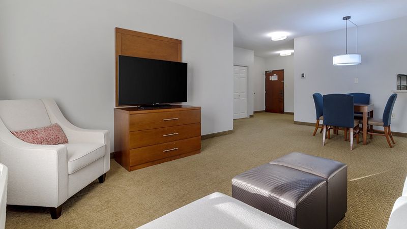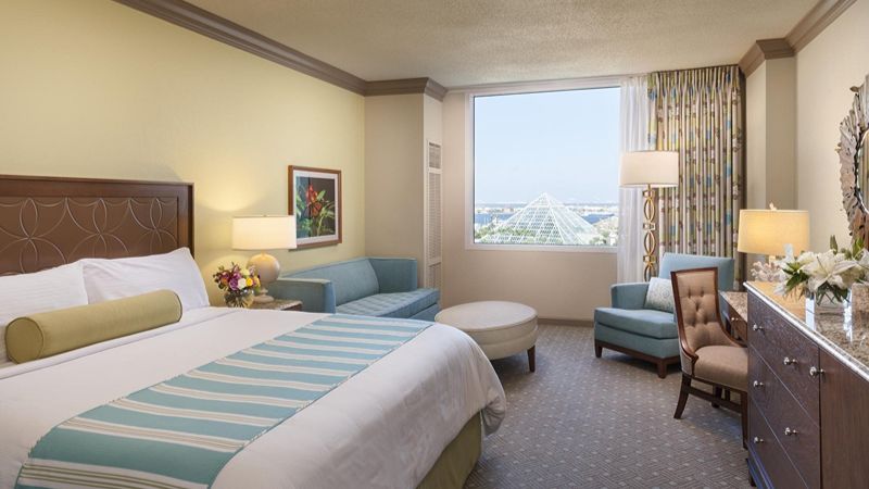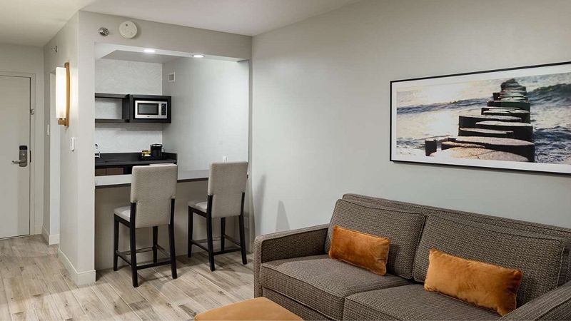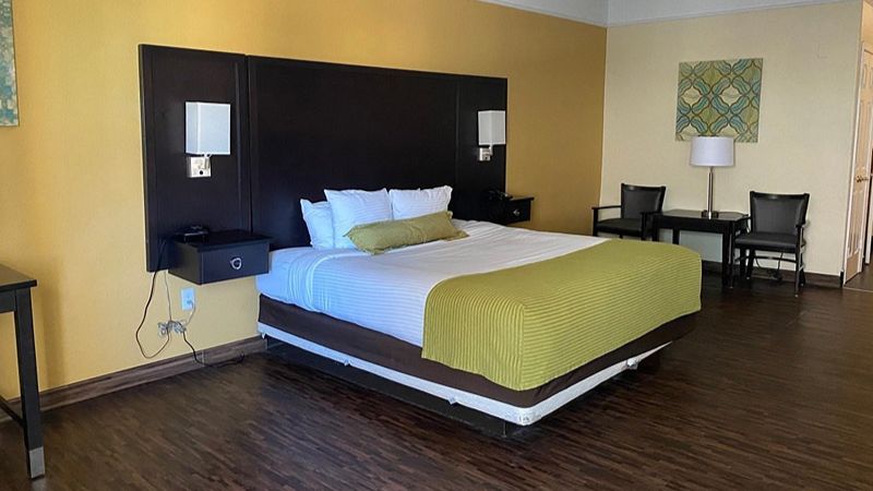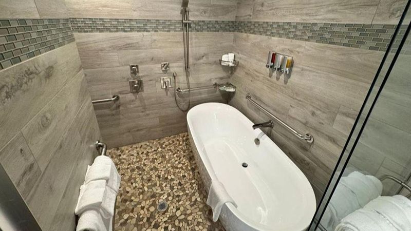 Older hotel that's a bit run down, BUT you can tell improvements have been made making it adequate for able-bodied individuals.. Newer furniture, newer beds, main area of hotel was clean and attractive looking, hotel room was ok. Really worn carpeting, Accessible bathroom was nice sized and easily accessible BUT the shower has not been properly cleaned for quite awhile because when I was assisting my disabled husband to shower, the floor of the shower was so slick from years of soap scum or some other slippery residue that we both fell. Walls are also vey thin, you will hear what the people in the rooms next to you are discussing. Also do not use their shuttle service if you are disabled because for our return trip the shuttle driver left us waiting for 2 hours then knowing my husband was in a wheelchair but could transfer the only seat remaining when he did finally return for us was in the back where there was no way to load my husband. We ended up riding in a different shuttle altogether becausemy husband was already left in the heat too long (resulting in my stroke Survivor husband getting heat stroke and an emergency room and hospital stay.) Overall not a bad hotel UNLESS you are disabled in any way. If you are disabled, or even have mobility issues, it is NOT a safe place for you to stay!!!!!