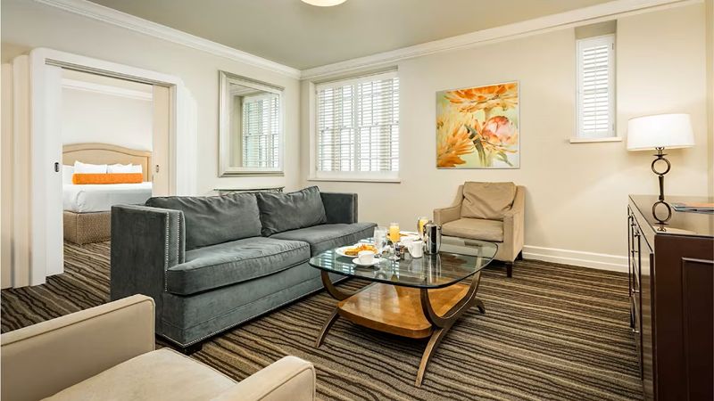 Quiet hotel with in-room Jacuzzi, pool and breakfast, at the far end of the Seawall, near historic Strand district.