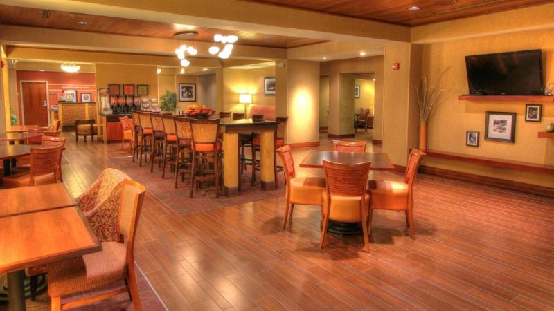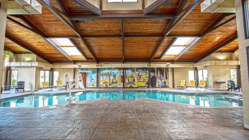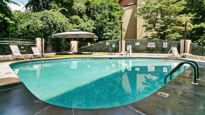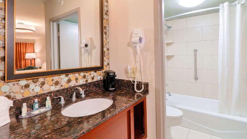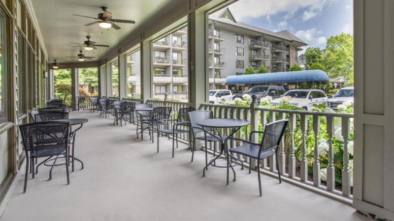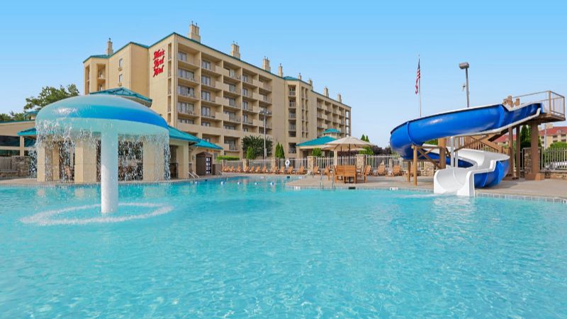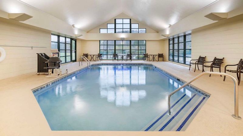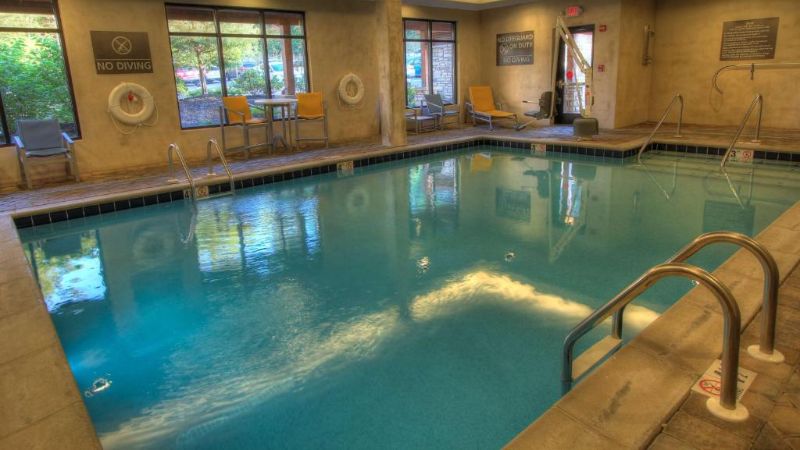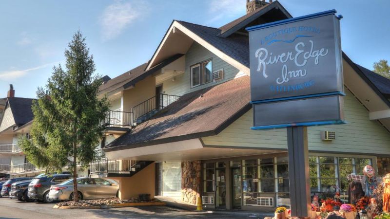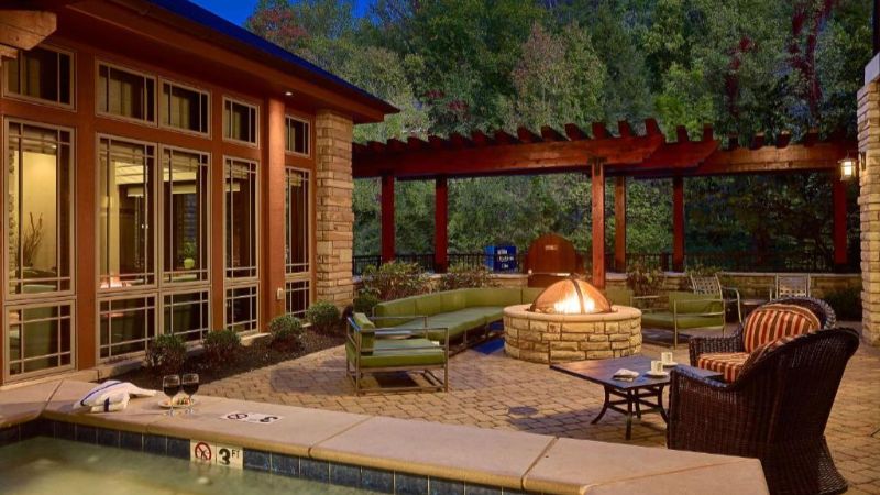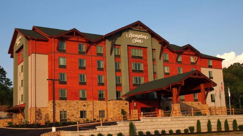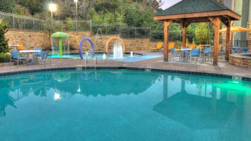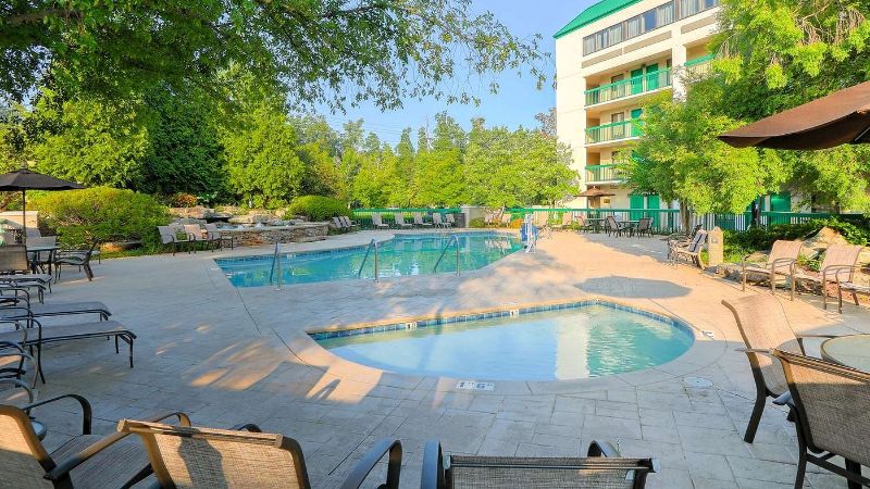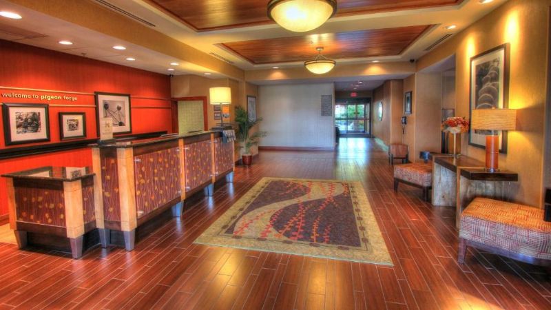Eco-friendly Hilton hotel with Jacuzzi in room, saltwater pool and restaurant at the Smoky Mountains’ base on River Road.
