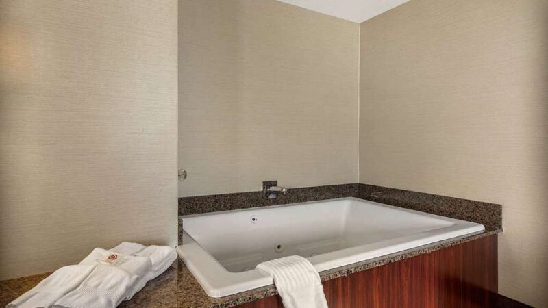 Suites include Jacuzzi tubs, seating areas, and modern amenities for a comfortable stay in Green Bay.