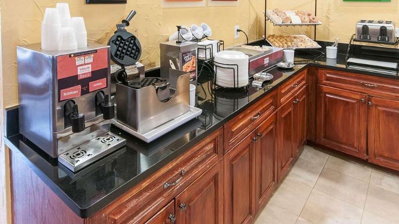 Our room was clean and had a fridge, coffee and tea with a kurig machine, iron and ironing board. The bedding was comfortable. The included breakfast was good. Waffles, eggs, coffees, tea and hot chocolate. There was an assortment of pastries.