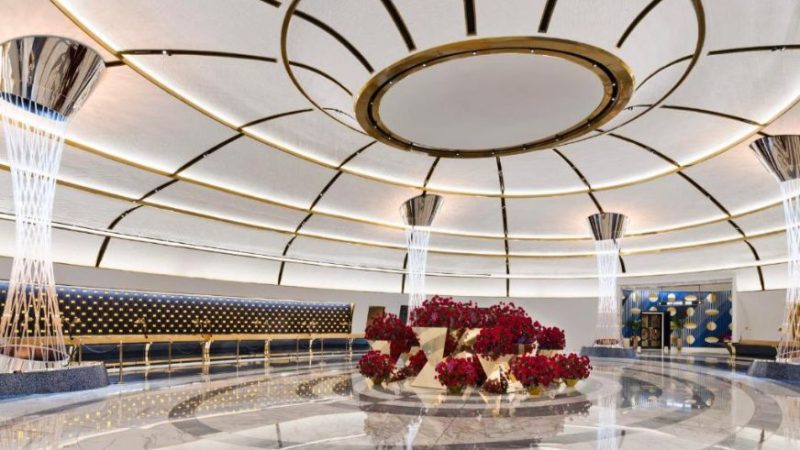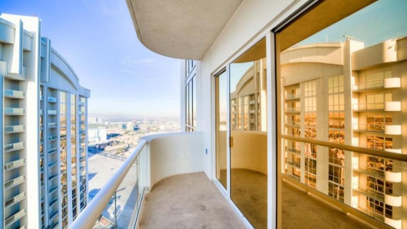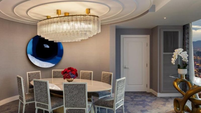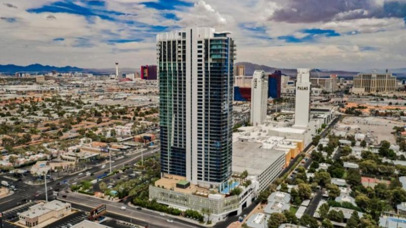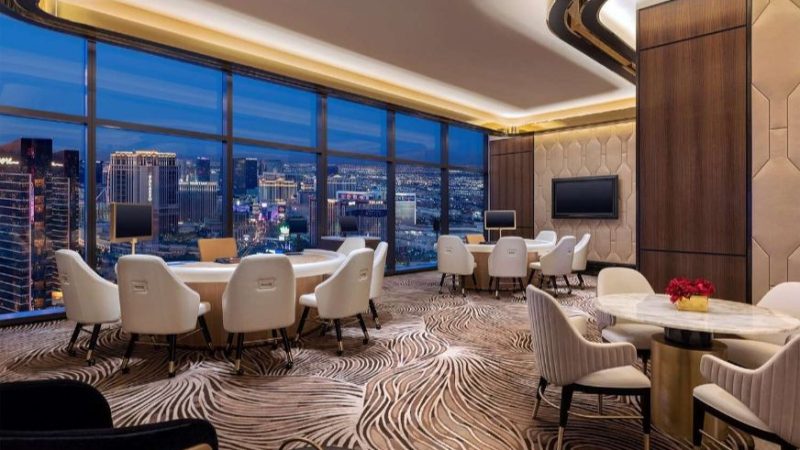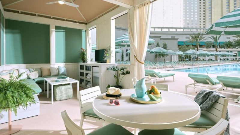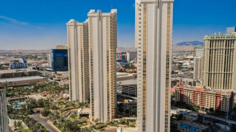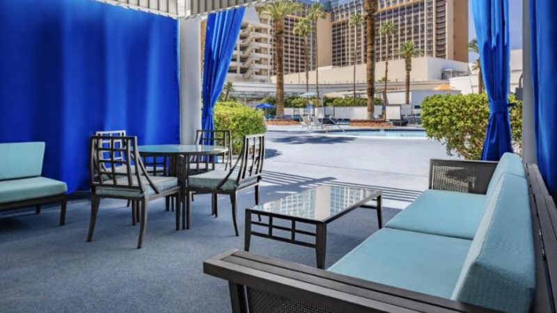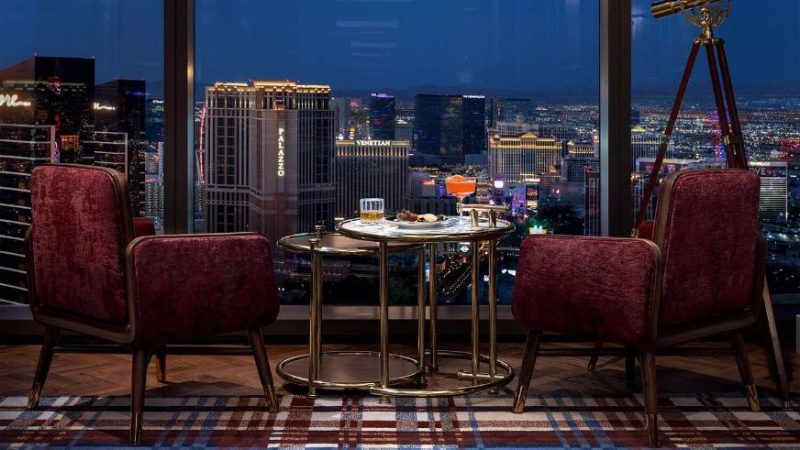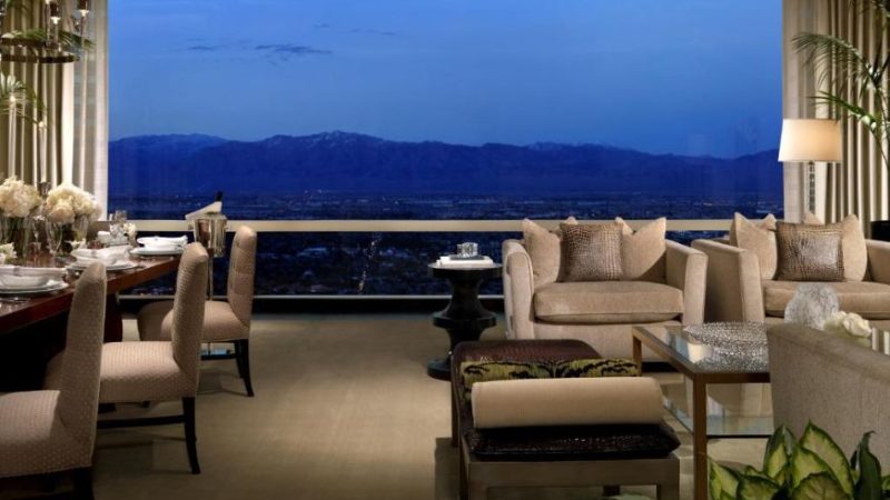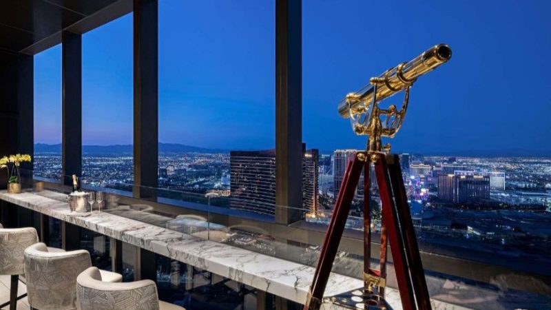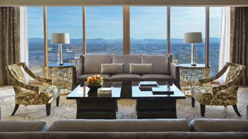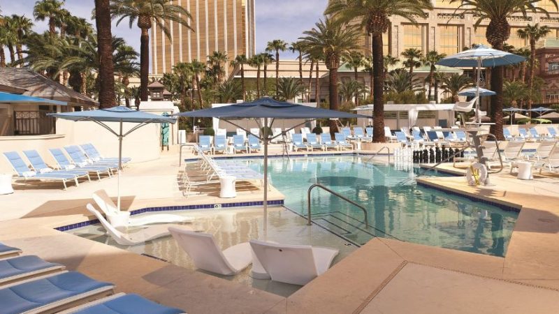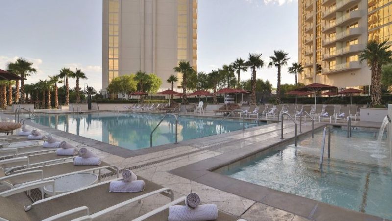 Lavish Strip hotel with private hot tubs, spas, golf, and fine dining, near the Convention Center in an iconic high-rise.