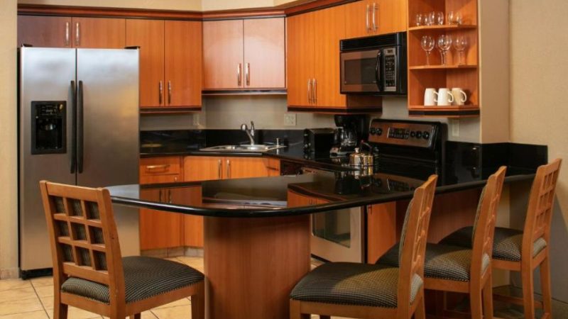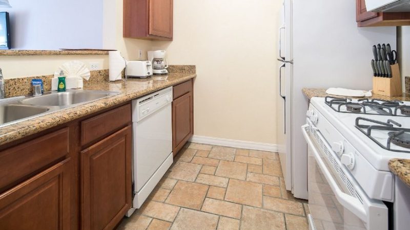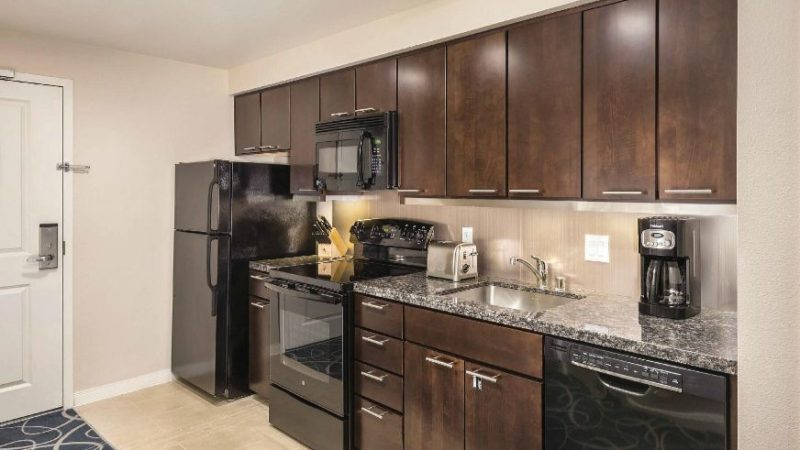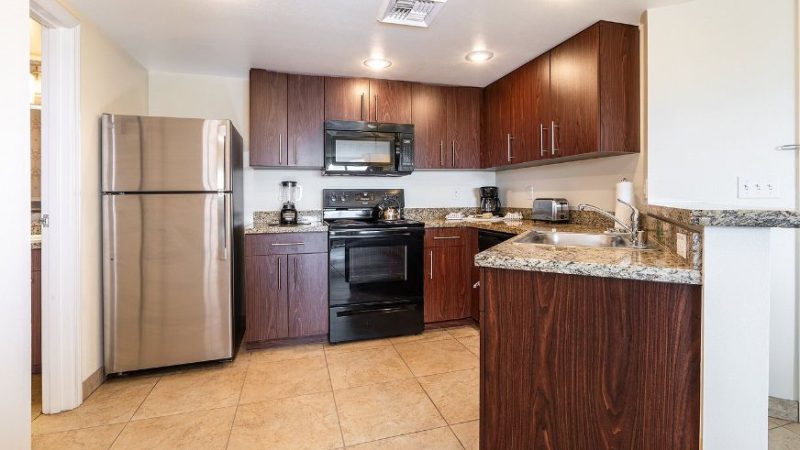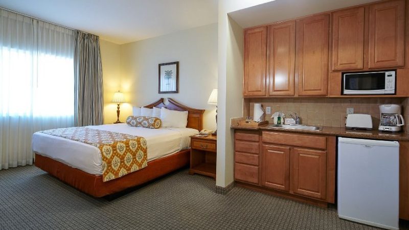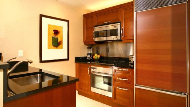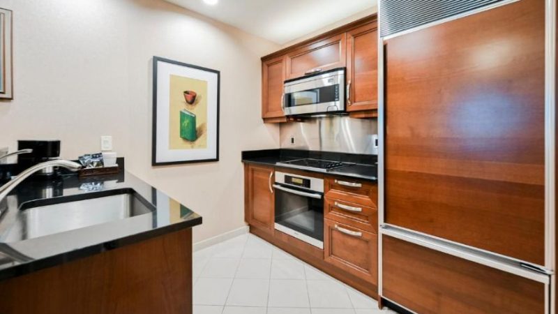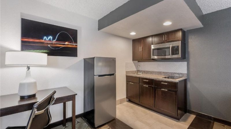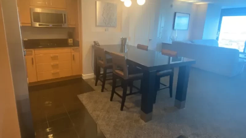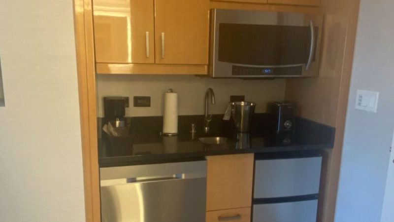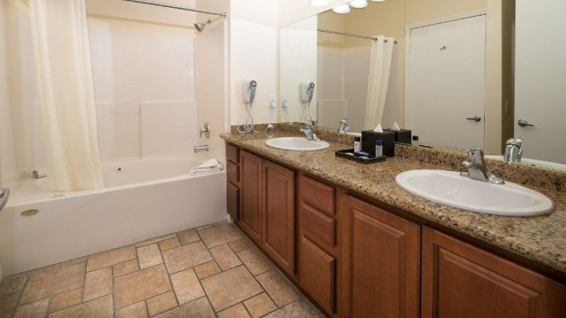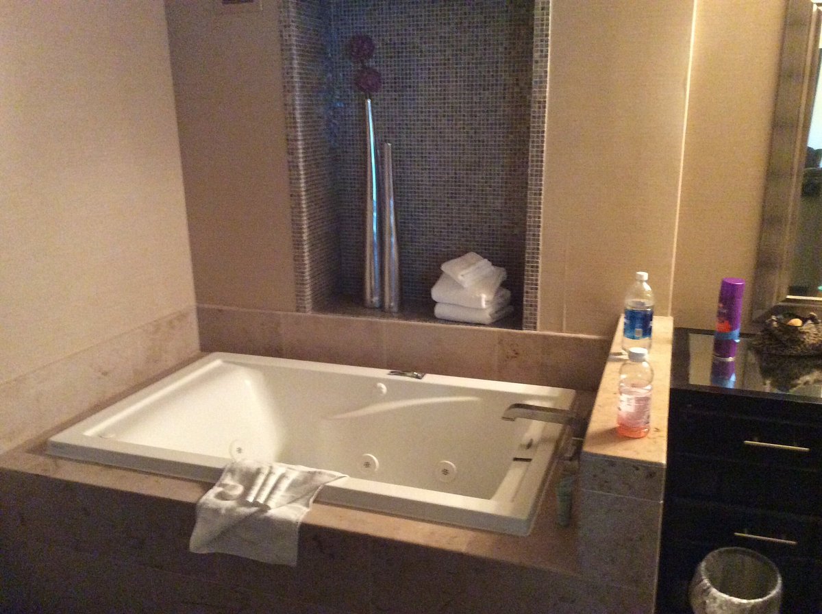 The hotel used to be condominiums before the 2008 crash, so each room (I think) has at least a stove, microwave, and small, but spacious fridge. The bathroom has a jacuzzi. Our own private jacuzzi!!