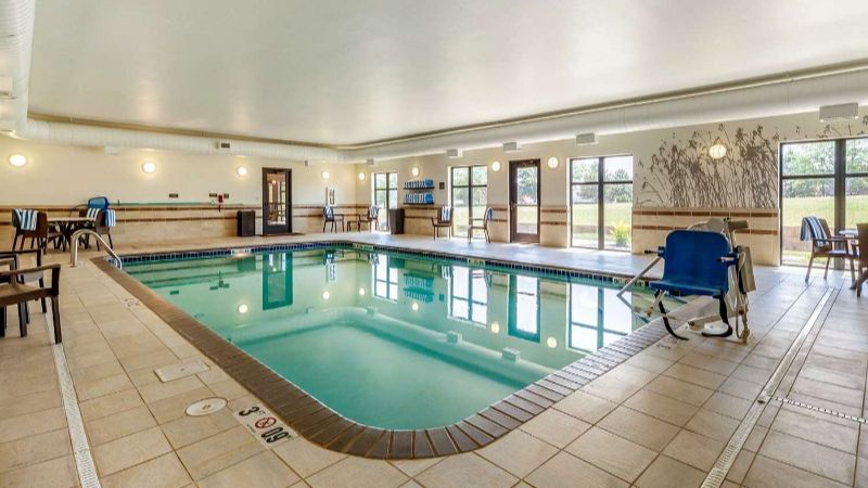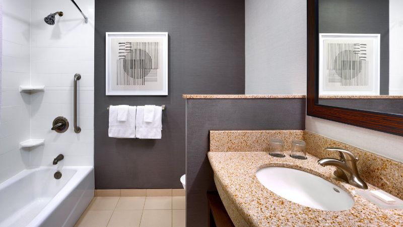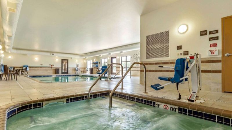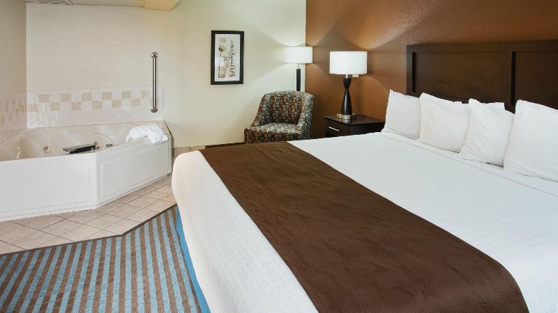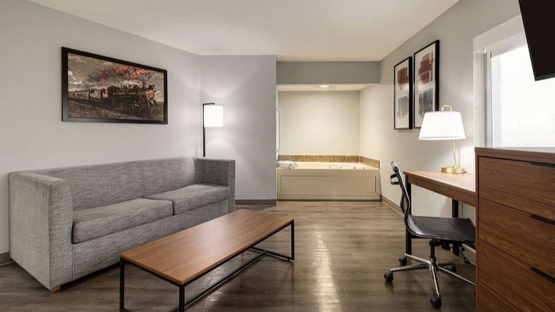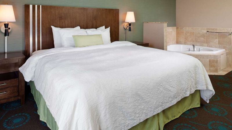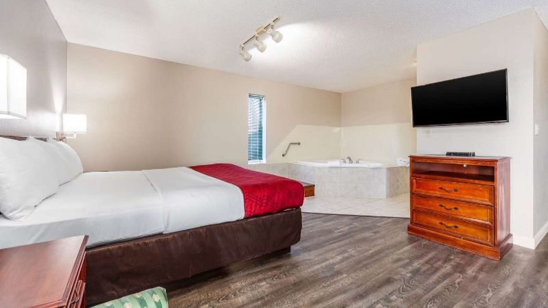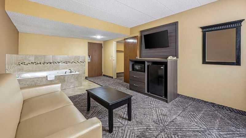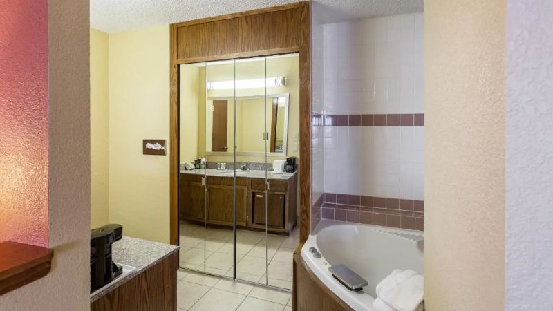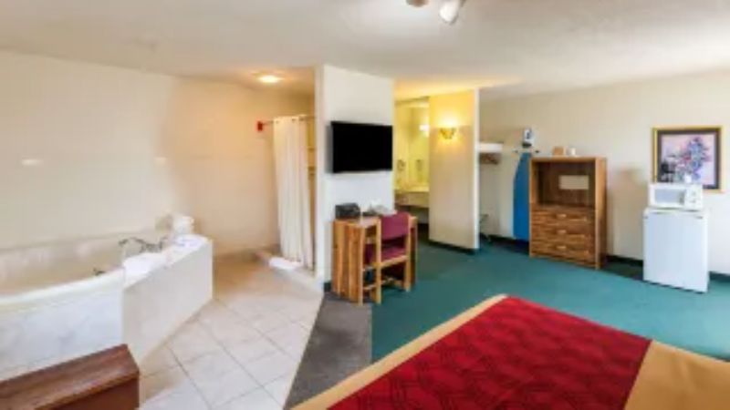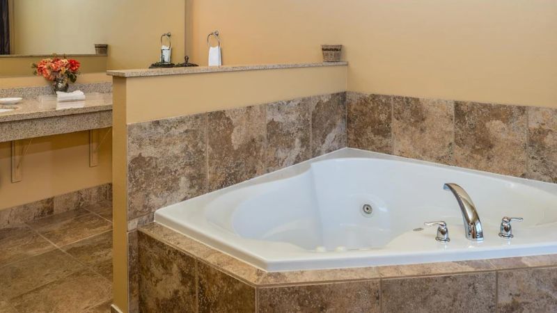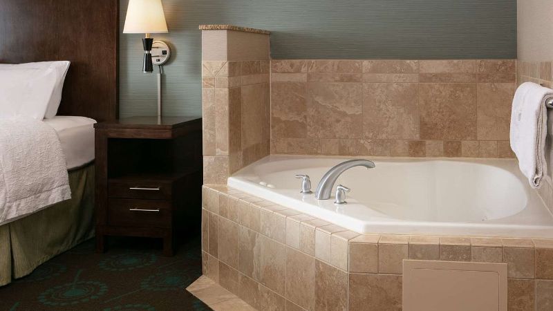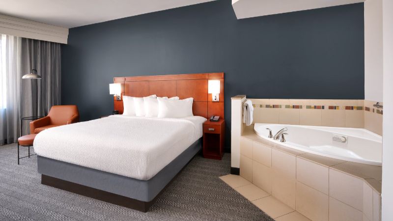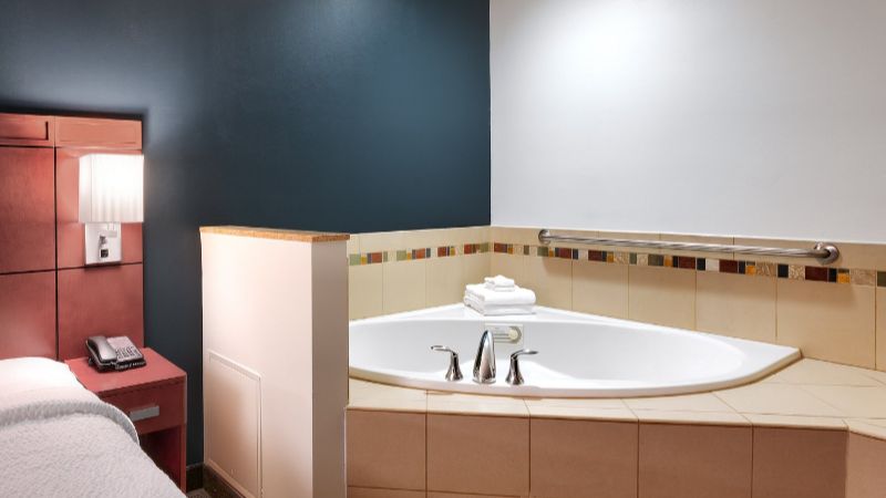 In addition to in-room hot tubs or Jacuzzis, many of these hotels provide free WiFi, on-site parking, fitness centers, swimming pools, and complimentary breakfast. Other amenities may include room service, laundry services, business centers, and on-site restaurants or bars.
