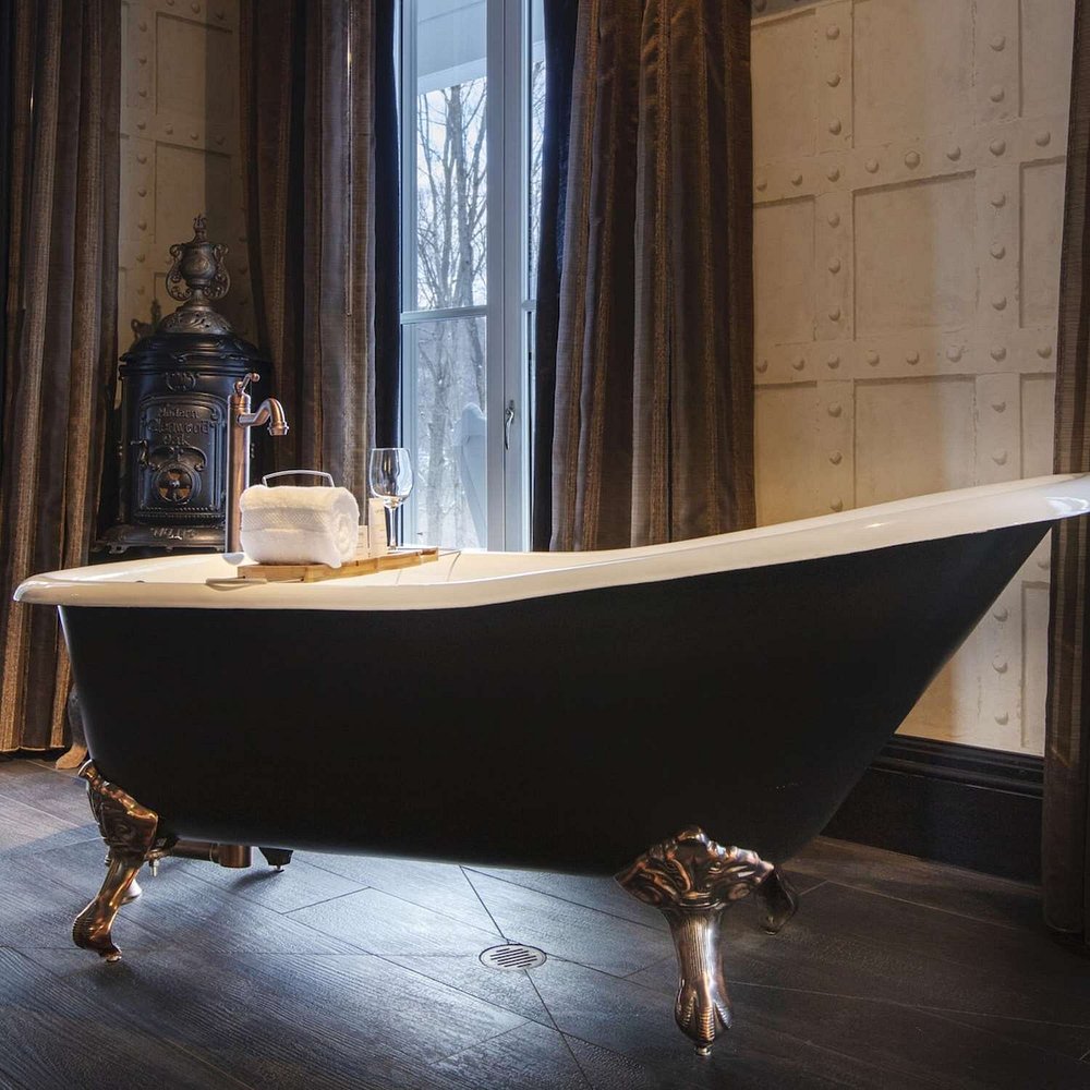 Whimsical luxury destination with Jacuzzi in room, dramatic themed rooms (like Dracula’s Fangs), and serene spa amenities just steps from nature in Roxbury.