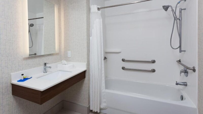 Front desk people were nice. When we looked at room, my husband went down there to tell them about switching me to a handicapped accommodations in the bathroom. Then, she told my husband there are no other rooms available. Well, this hotel chain should have more handicapped accessible rooms. Another thing, put a wheelchair on the 1st floor not higher. Your bathroom had one rail, no rails by toilet, not enough towels in room, and #1 no roll in shower for a wheelchair. I'm adding pictures to show you what a handicapped bathroom should look like. I hope that a lot of people share this post. I hope ADA sees this as well. THIS HOTEL SHOULD HAVE ACCOMODATIONS IN THE BATHROOM FOR A WHEELCHAIR?!?! Your room that your front desk person said it had handicapped accommodations in bathroom. Well, my bathroom (221) was NOT?!?! The pictures below is what should have been in my bathroom.