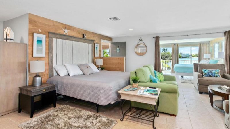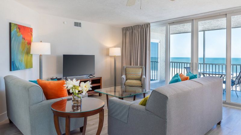 Beachfront resort with jacuzzi in room, full kitchens, and screened balconies for island relaxation.