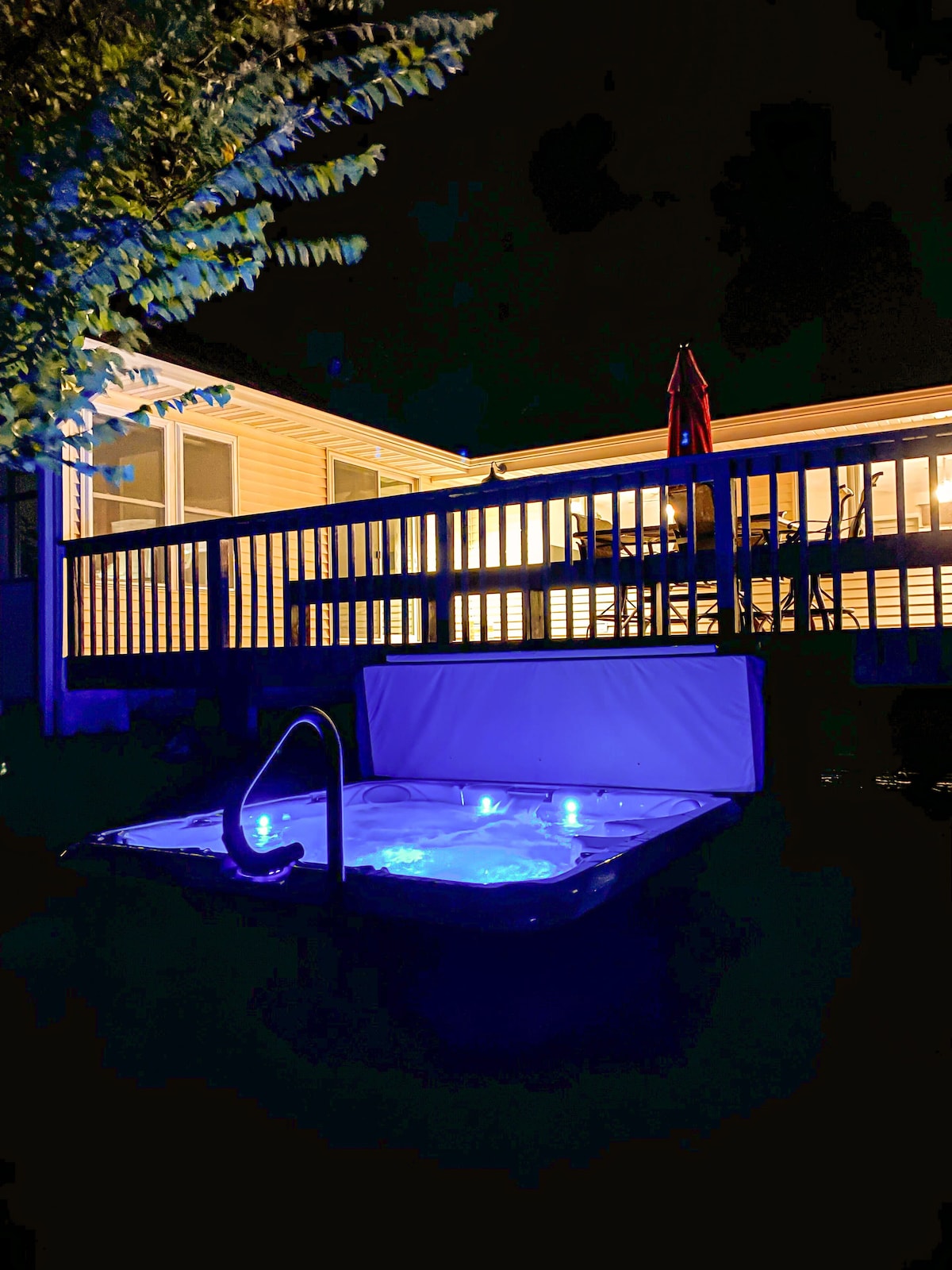 Scenic riverfront home with sunset views, full kitchen, smart TVs, bike trail access, and private hot tub.