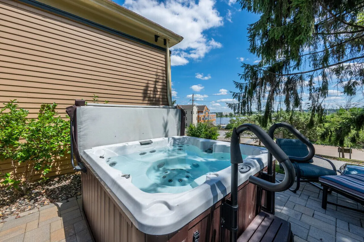 Three-story 1880s riverfront home with hot tub, fire pits, game room, smart kitchen, and Mississippi views.
