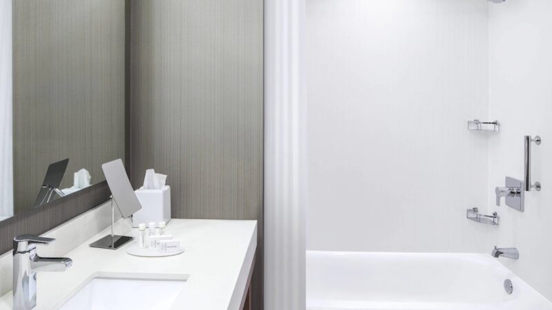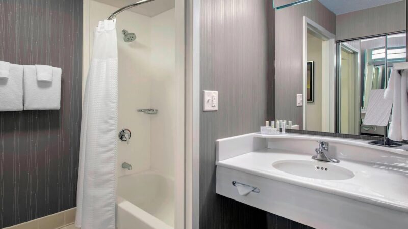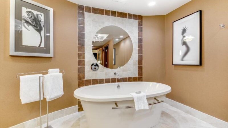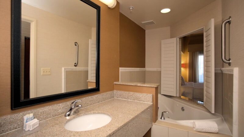 The following hotels with Jacuzzi in room in New Jersey have an on-site restaurant – Hyatt Regency New Brunswick, with prices starting from $169 per night, The Westin Jersey City Newport at $569 per night, and Marriott’s Fairway Villas, A Marriott Vacation Club Resort at $179 per night.