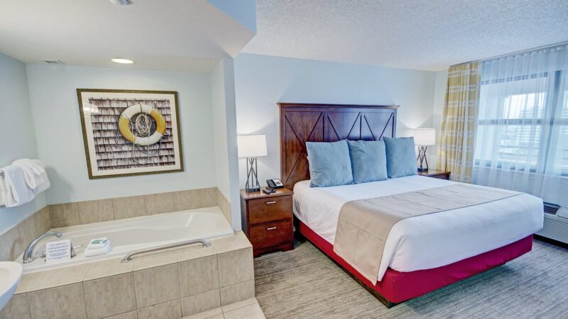 In New Jersey, the following hotels with hot tub suites include a spa – Mountain Creek starting at $559 per night, Bolero Resort & Conference Center at $226 per night, and the Seapointe Village Resort at $762 per night.
