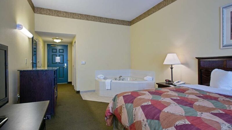 Romantic hotel with Jacuzzi in room, pool and free breakfast, 3.2 miles from downtown.