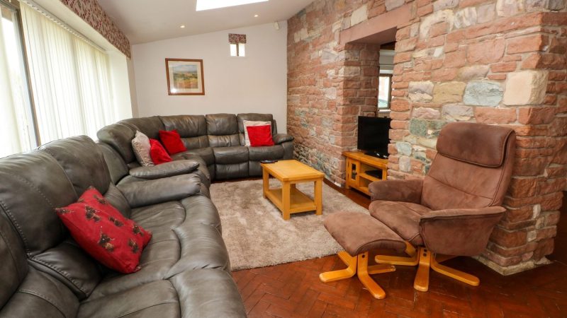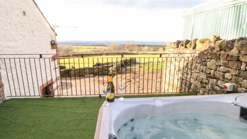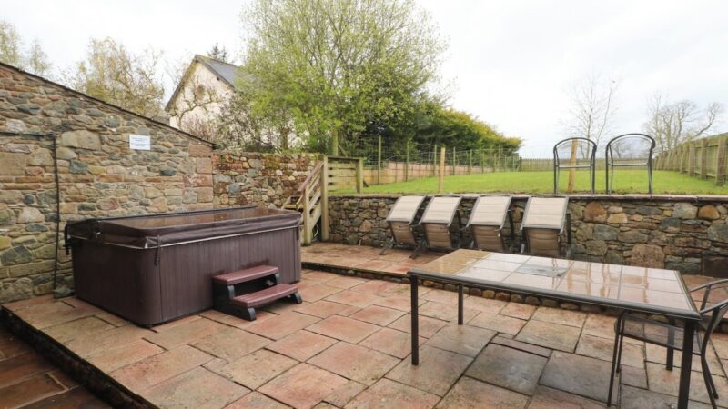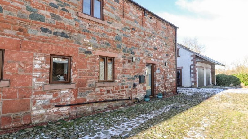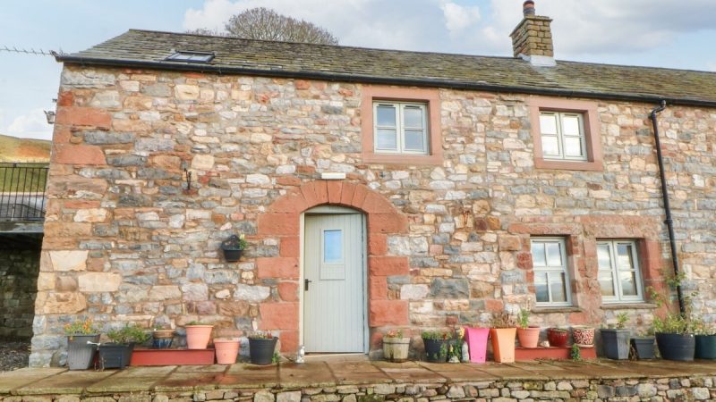 Charming end-terrace barn near Penrith, with spacious lawned garden, private spa tub, and off-road parking.