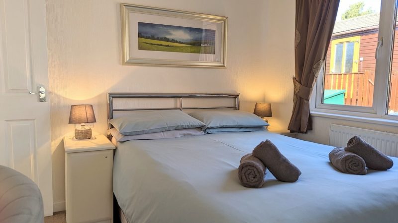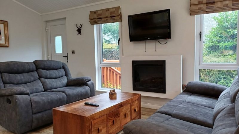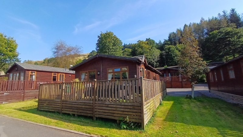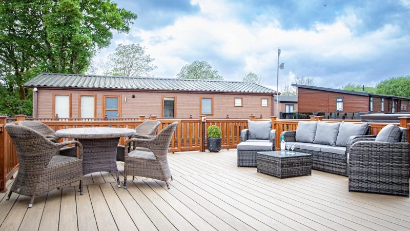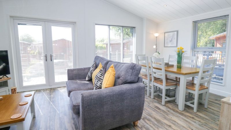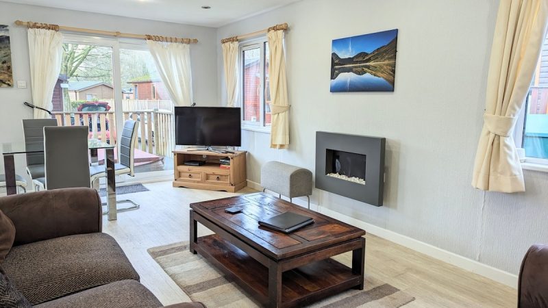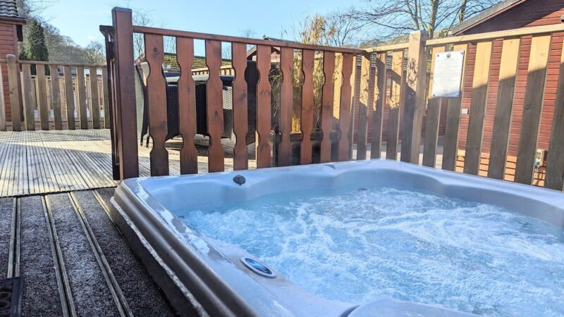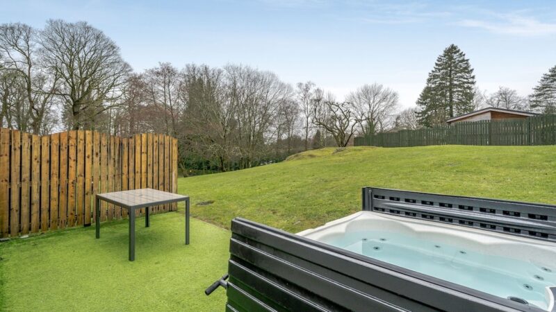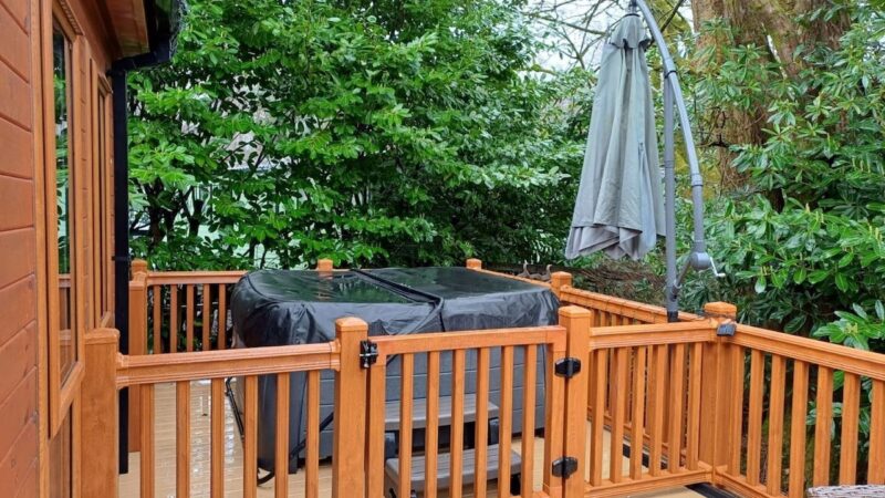 Comfortable pet-friendly lodge with private outdoor hot tub, spacious decking area, and ensuite master bedroom.