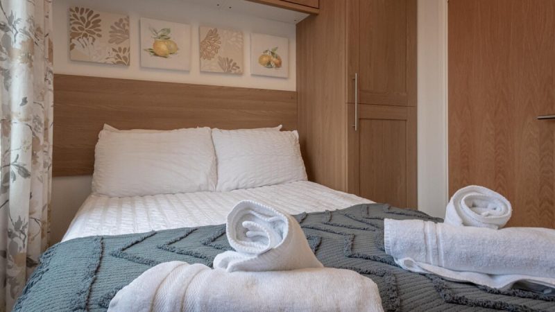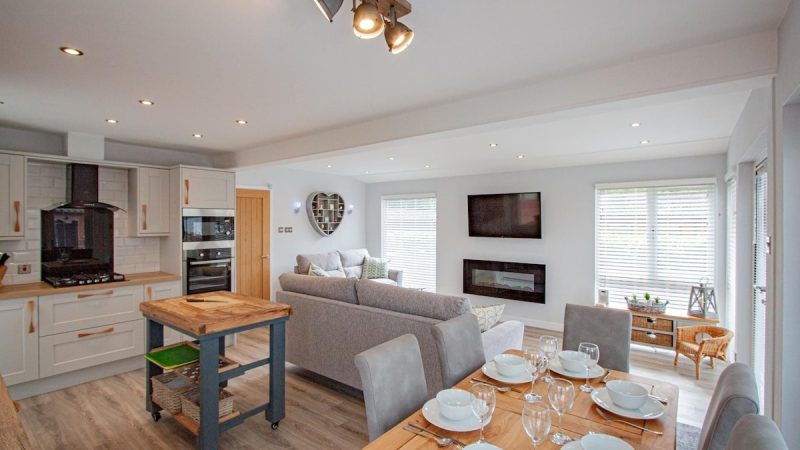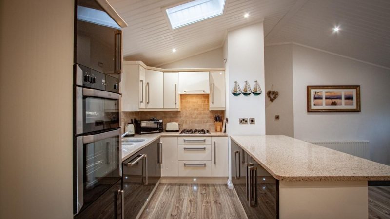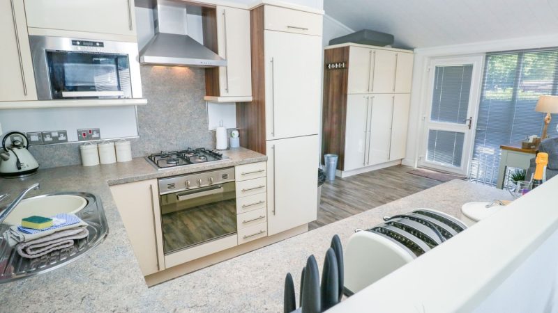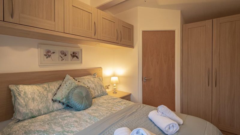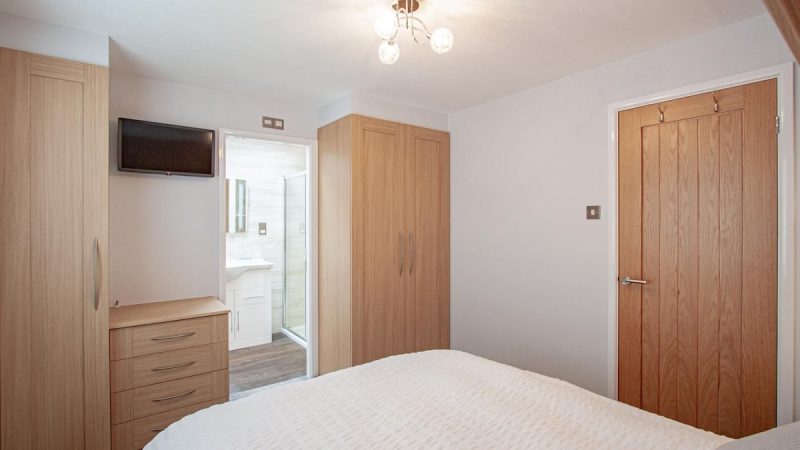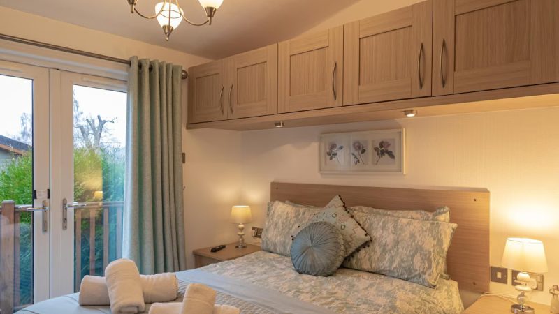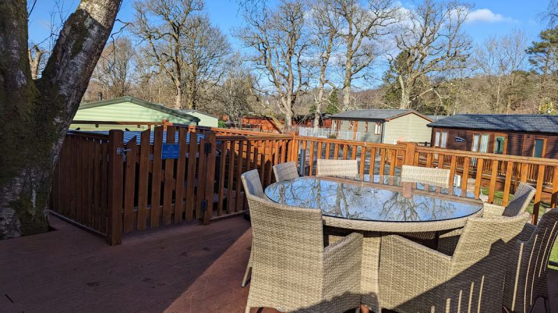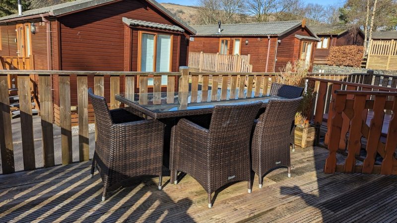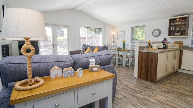 Comfortable pet-friendly lodge with private outdoor hot tub, spacious decking area, and ensuite master bedroom.