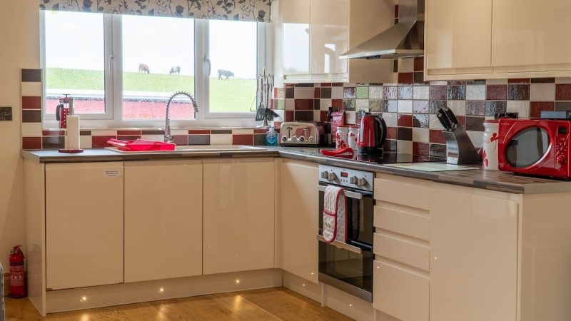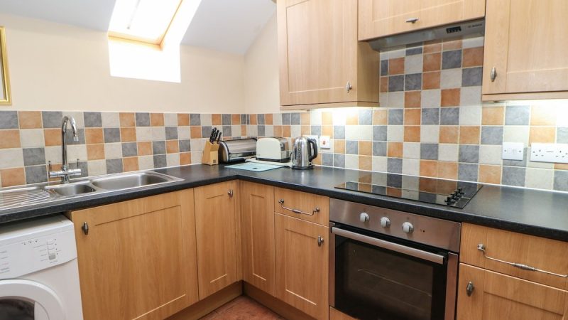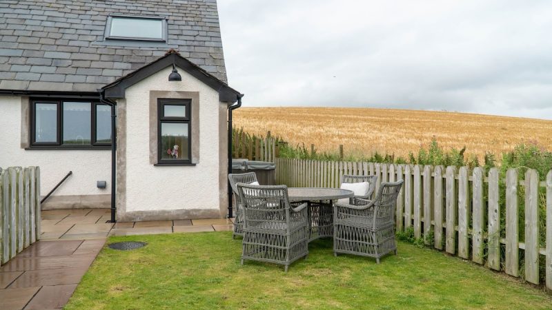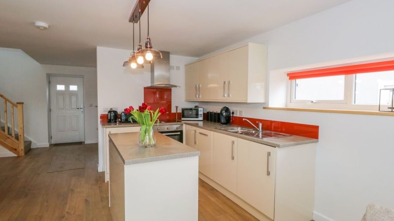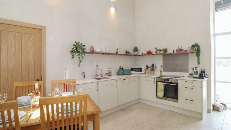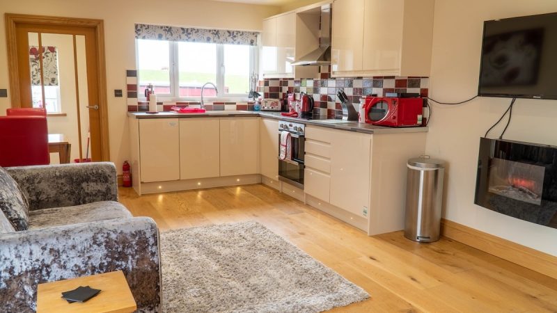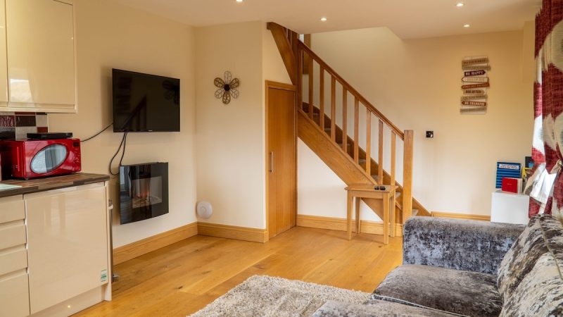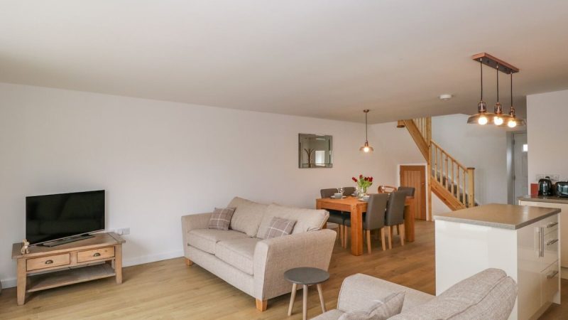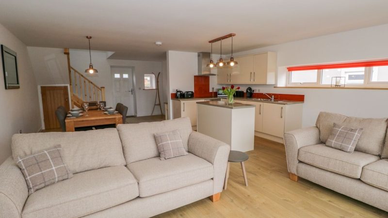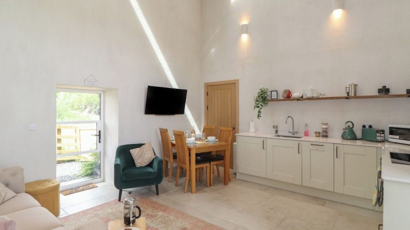 A cozy barn accommodation with sea views, a private hot tub, a fully equipped kitchen, and a comfortable lounge area.