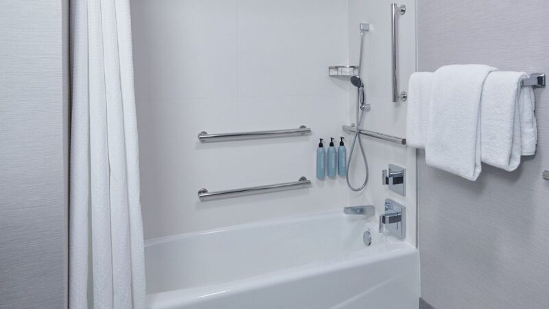 Modern Marriott hotel with fitness center, indoor pool, and private spa tubs, connected to Laurel Park Place mall.