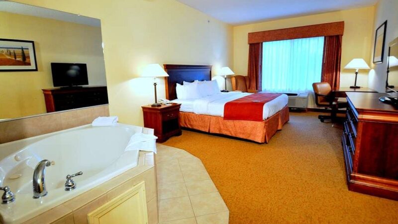 Besides the Jacuzzi or hot tub, guests can typically enjoy amenities such as plush bedding, breathtaking views, complimentary Wi-Fi, flat-screen TVs, luxury bath products, and sometimes even a fireplace in the room. Hotels also often have on-site restaurants, fitness centers, and spas for a fully pampering experience.