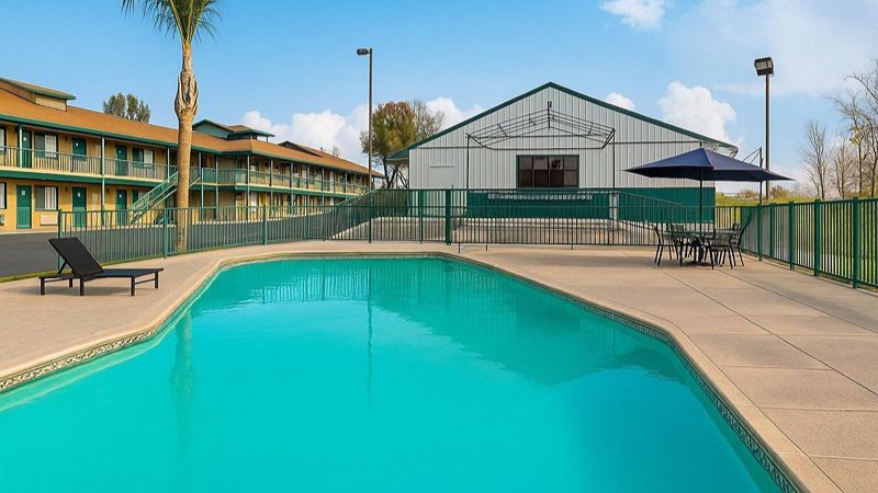 A pet-friendly hotel offers a private jetted tub, a seasonal outdoor pool, and cozy bedding near Lemoore City Park.