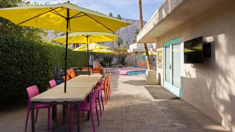 We have two great hotels in South Palm Springs. First, we have Yara Hotel, a Spanish-style luxury boutique hotel with private spa tubs and a saltwater pool. Booking a weekday stay here is much cheaper at around $216 per night, but weekend stays can get much pricier at roughly $523 per night.