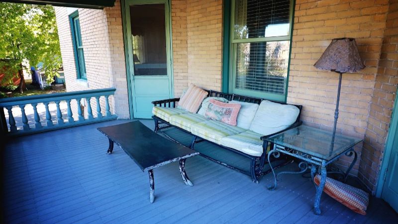My room had a shared porch to relax on that had plenty of shade. Bed was comfortable and room was quiet, even with a busy train track located 2 blocks east.