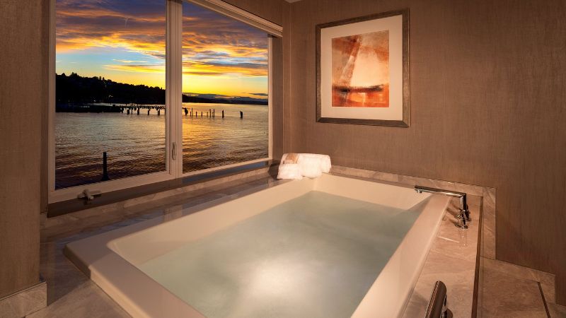 For Couples: Silver Cloud Hotel Tacoma at Point Ruston Waterfront offers the Jacuzzi in room with stunning Puget Sound views.