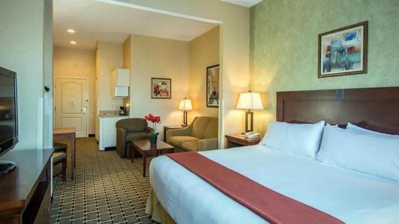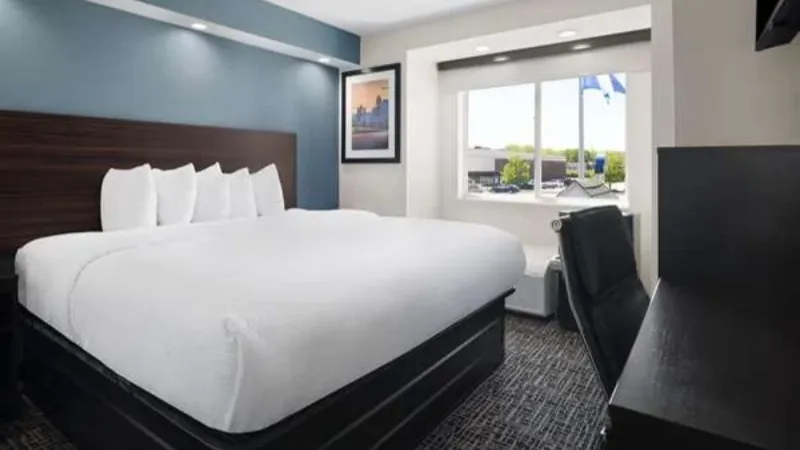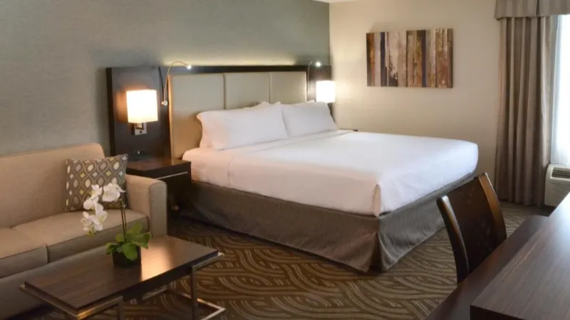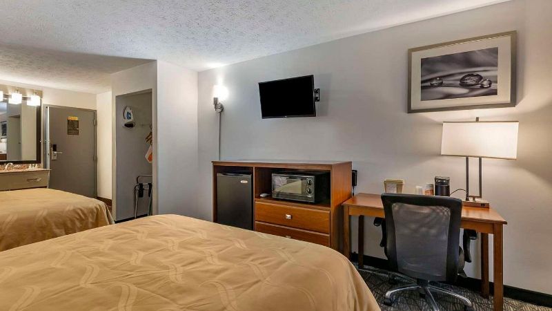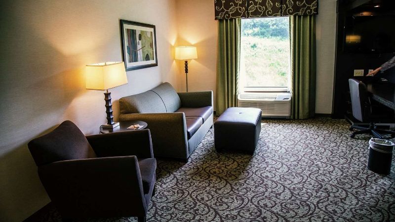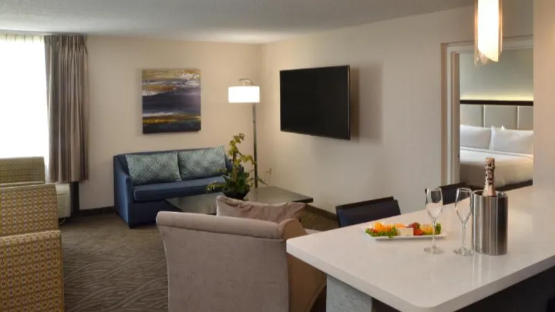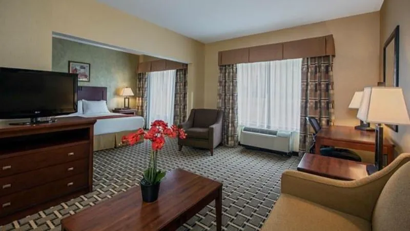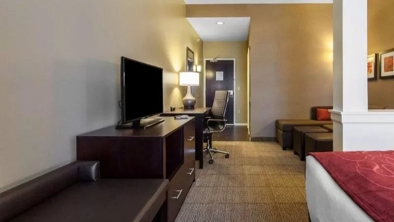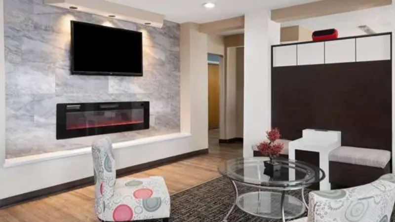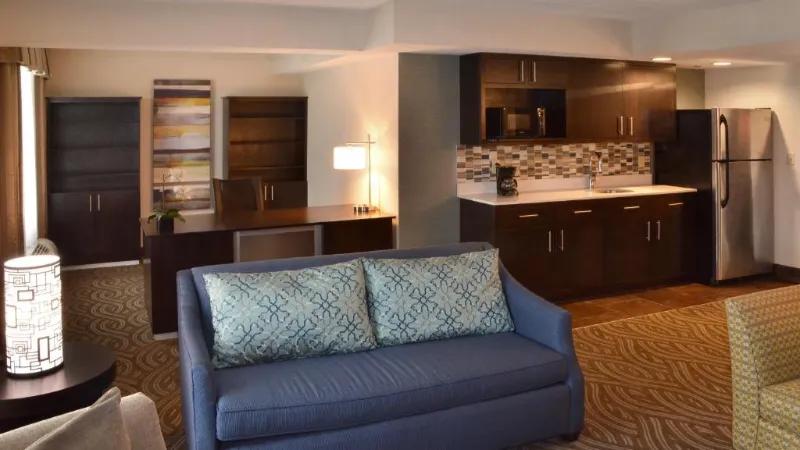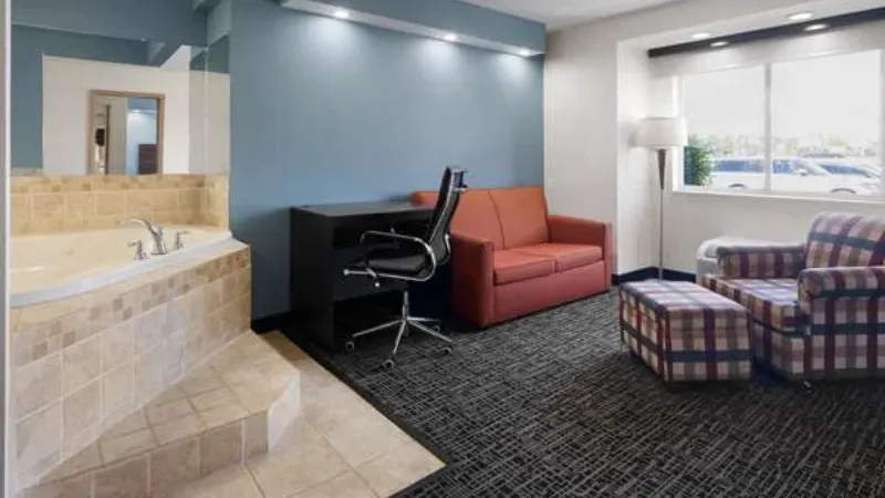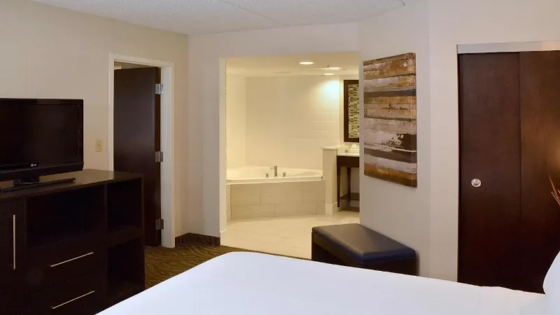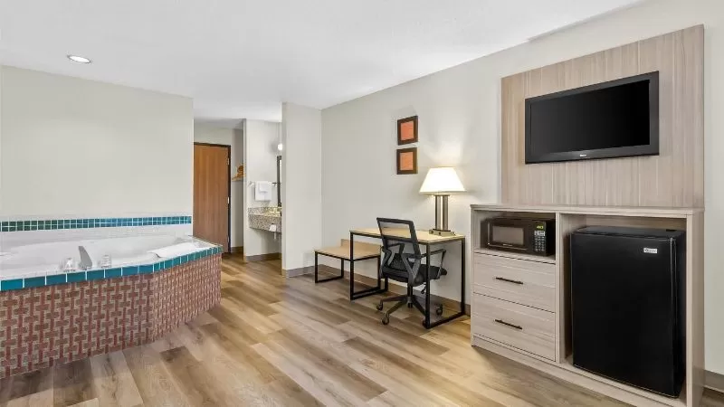 Contemporary suites offering private spa tub, microwave, flat-screen TV, mini-fridge, and work desk in Youngstown.